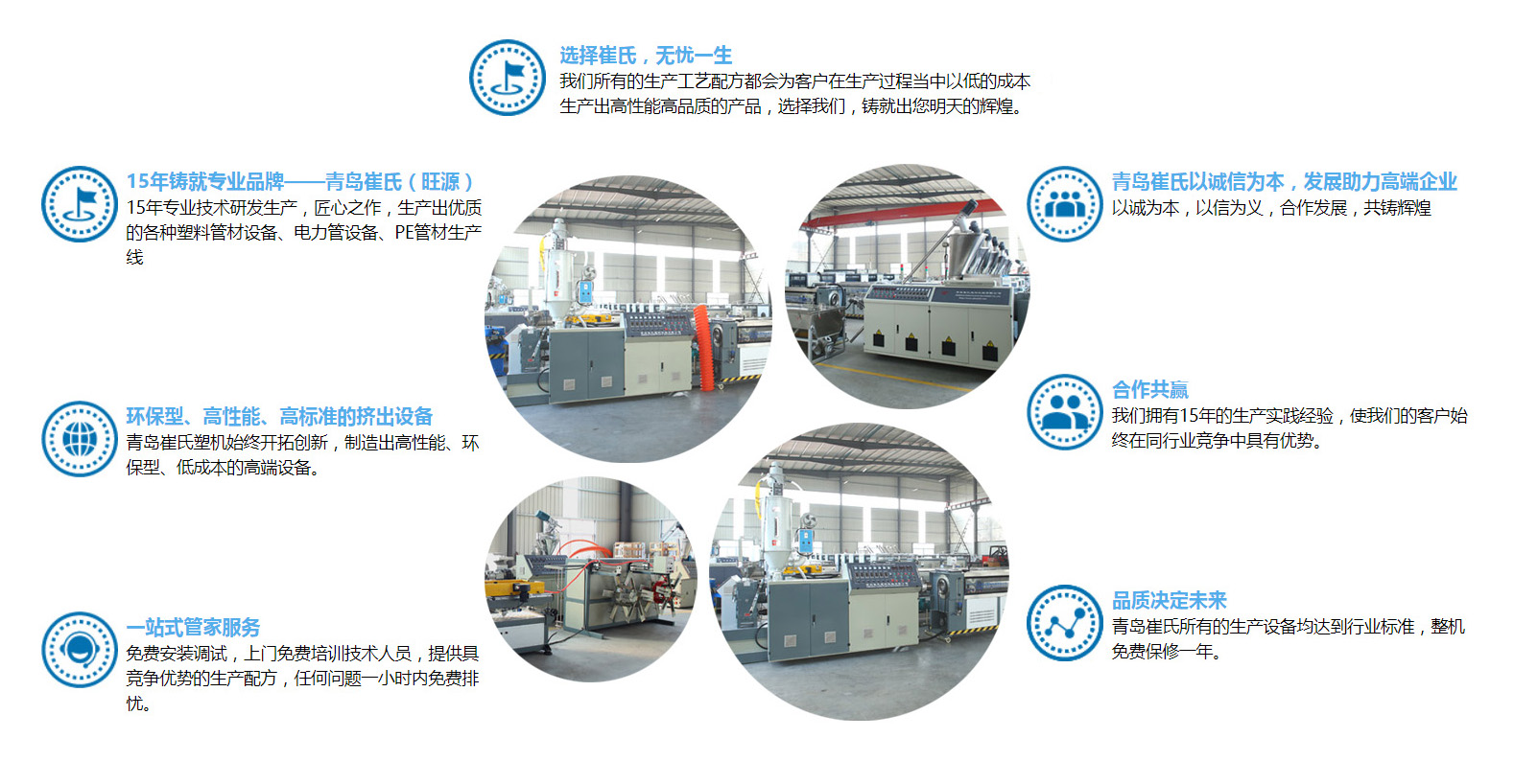 青島崔氏塑料機(jī)械有限公司始終以開拓創(chuàng)新的精神,緊跟世界塑機(jī)行業(yè)的發(fā)展趨勢(shì),專注研發(fā)與生產(chǎn)預(yù)應(yīng)力波紋管全線設(shè)備,公司已有20多年的生產(chǎn)與實(shí)踐經(jīng)驗(yàn),在市場(chǎng)大環(huán)境下,緊跟國(guó)家發(fā)展趨勢(shì),使我們的客戶在市場(chǎng)競(jìng)爭(zhēng)中有一席之地,人生就是不斷決定的過(guò)程、決定沒有對(duì)與錯(cuò),只有得與失!選擇崔氏我們定不負(fù)卿。
